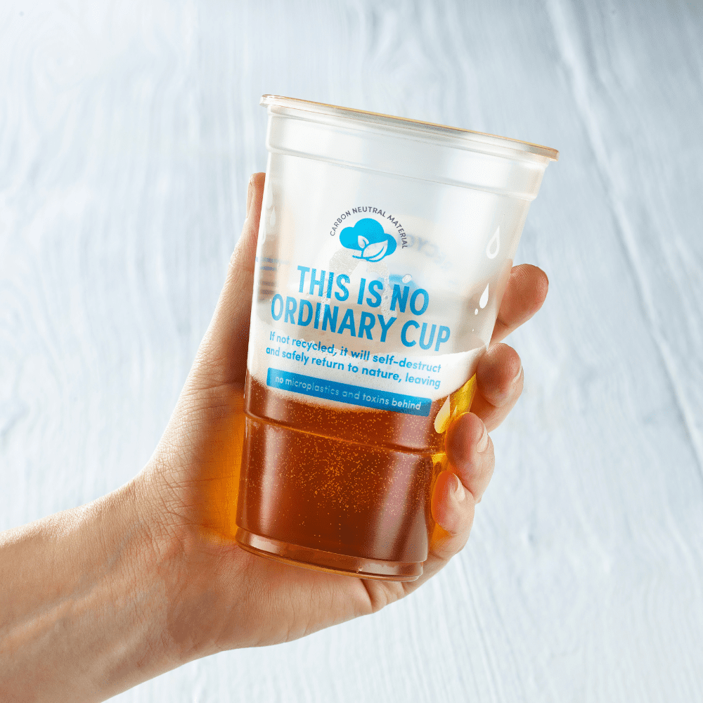 The tumblers made from this material can either be collected and recycled or if for some reason they become part of the fugitive plastic waste stream, which is approximately 32% of all plastics, that’s about 2 billion tonnes, they will biodegrade in less than a year, without any micro plastic being present.