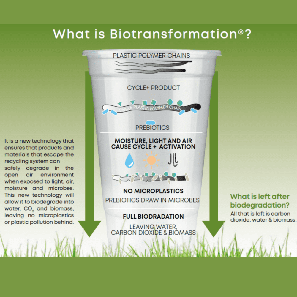 Is the technology the same as oxo-biodegradable? Absolutely Not. Unlike Oxo-degradable, Biotransformation builds on the synergetic action of UV, air, heat, moisture and microbes to chemically transform the product into bioavailable oligomeric residue. The process is microplastic-free and does not leave any harmful substances behind.